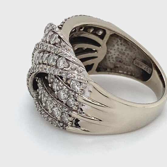 Description: LADY'S DIAMOND FASHION RING: 7.8g; 5DWT 10K-W/G, 20-ROUND BRILLIANT CUT DIAMOND 0.60CTW, 18-ROUND BRILLIANT CUT DIAMOND 0.25CTW, 36-ROUND BRILLIANT CUT DIAMOND 0.150CTW, 46-ROUND BRILLIANT CUT DIAMOND 0.180CTW; SIZE:7.5