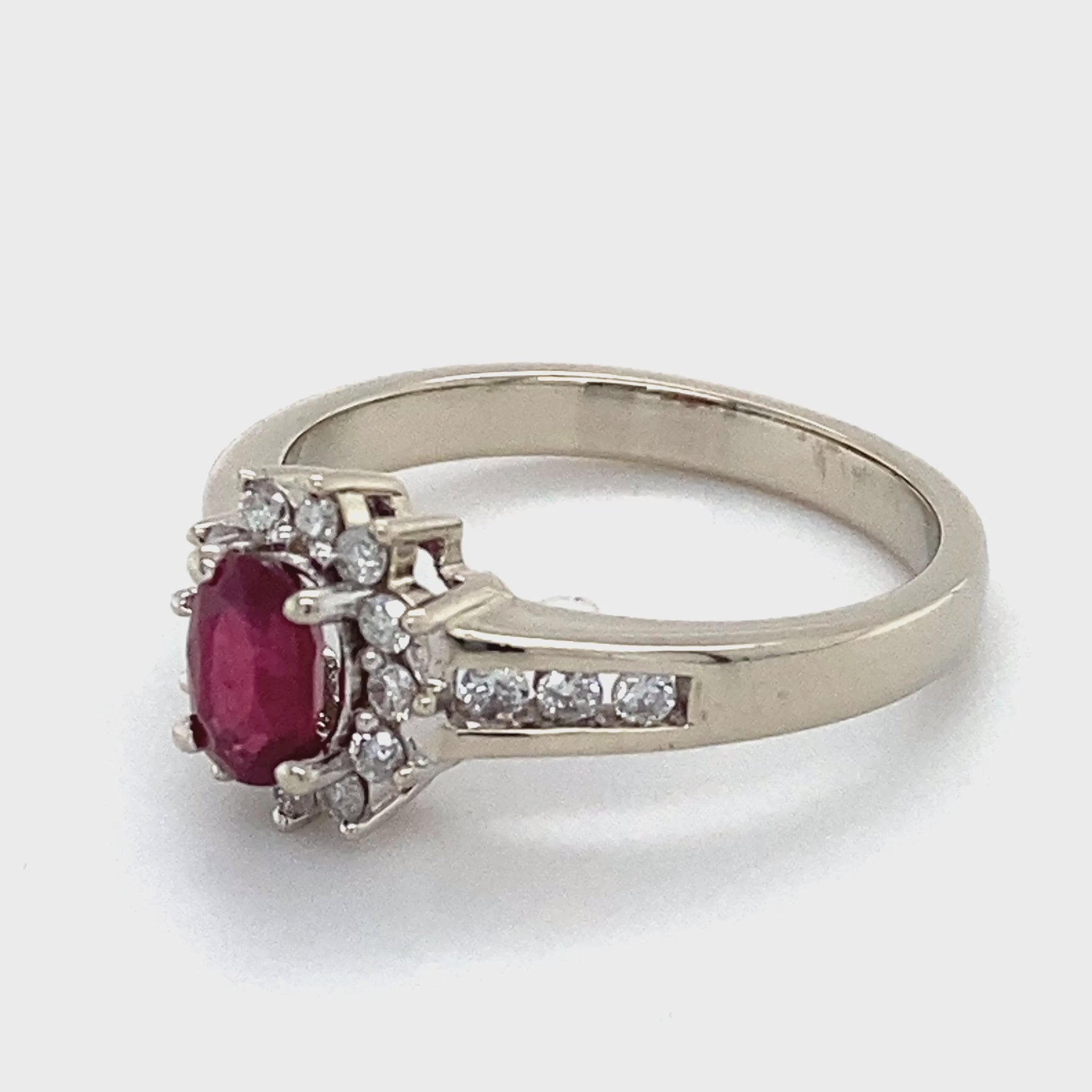 Description: LADY'S STONE & DIAMOND RING: 2DWT 10K-W/G, 1-ROUND CUT RUBY 0.97CTW, 16-ROUND BRILLIANT CUT DIAMOND 0.20CTW; SIZE:7