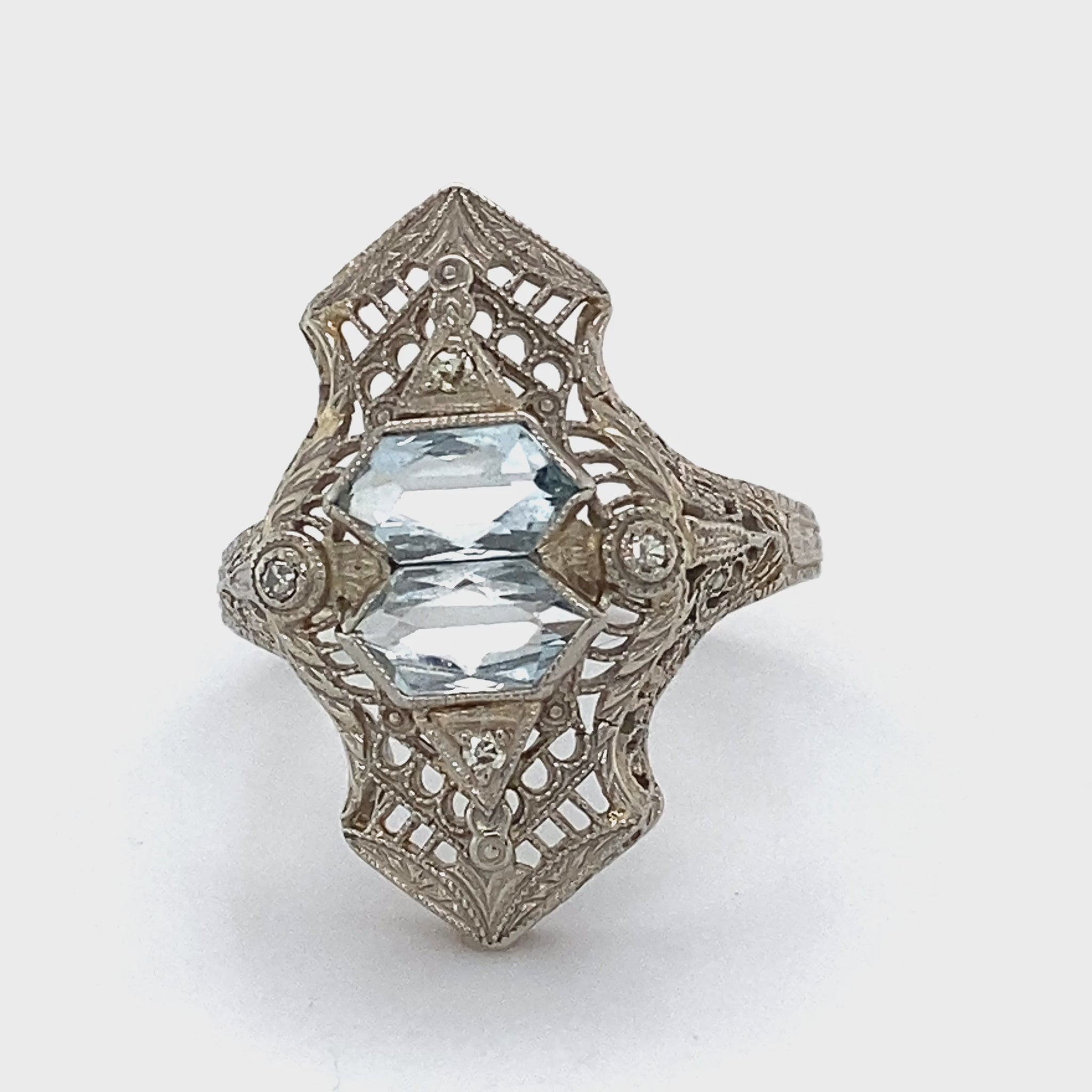 Description: LADY'S STONE RING: 3.8g; 2.4DWT 14K-W/G, 2-CUSHION CUT AQUAMARINE 0.82CTW, SIZE: 8.5