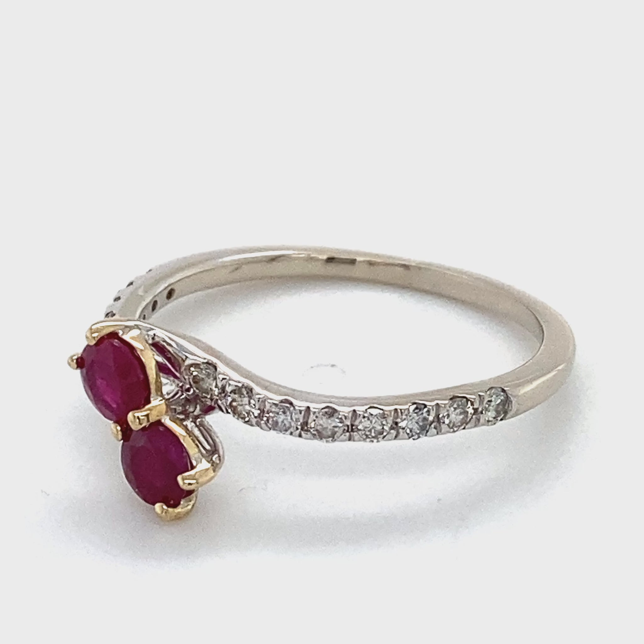 Description: LADY'S STONE & DIAMOND RING: 1.3DWT 14K-W/G, 2-ROUND CUT RUBY 0.82CTW, 16-ROUND BRILLIANT CUT DIAMOND 0.20CTW; SIZE:8